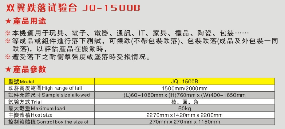 1. 跌落高度范圍:400—1500mm(可定制)