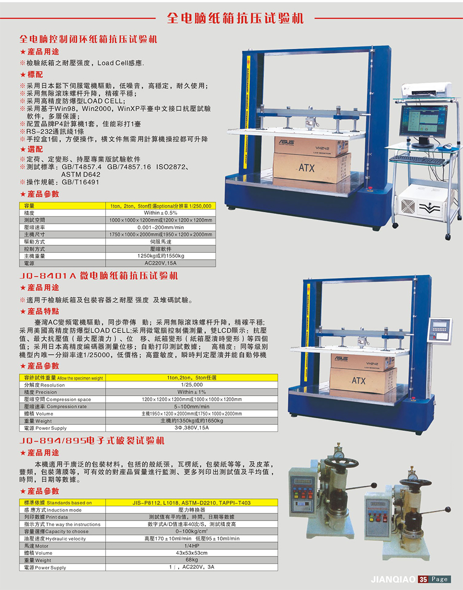 產(chǎn)品型號:JQ-8401 品牌:劍 喬 用途:全智能電腦控制紙箱耐壓測試儀/整箱抗壓試驗(yàn)機(jī)/空箱抗壓強(qiáng)度測試儀是一款多功能標(biāo)準(zhǔn)型紙箱質(zhì)量檢驗(yàn)設(shè)備,主要用于各類中等常規(guī)尺寸瓦楞紙箱的抗壓強(qiáng)度試驗(yàn)或其他材料制成的抗壓強(qiáng)度小