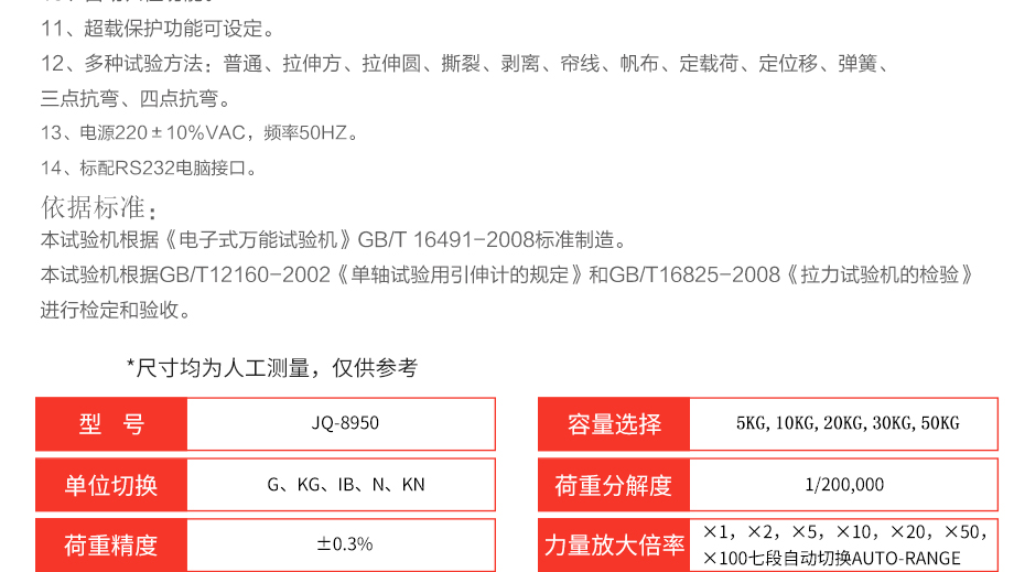 產品型號:JQ-8950 品牌:劍 喬 用途:本系列機廣泛用于各類薄膜、五金、橡膠料、紡織、建材、絕緣體、電線、電纜、端子等各類材料。測試其拉伸、撕裂、穿刺、剝離、抗壓、彎曲、抗剪切、定荷重、定位移、三點抗折