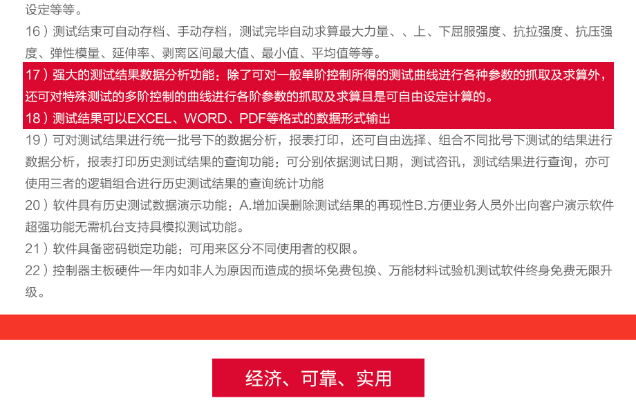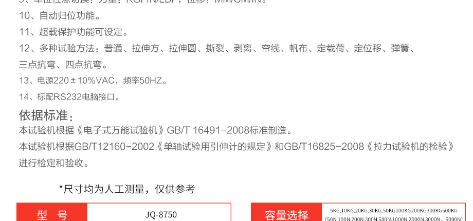 產(chǎn)品型號(hào):JQ-8750 品牌:劍 喬 用途:本系列機(jī)廣泛用于各類五金、金屬、塑膠、橡膠料、紙品、包裝、鞋類、皮革、服裝、紡織、建材、絕緣體、電線、電纜、端子等各類材料。測(cè)試其拉伸、撕裂、剝離、抗壓、彎曲、抗剪切、定